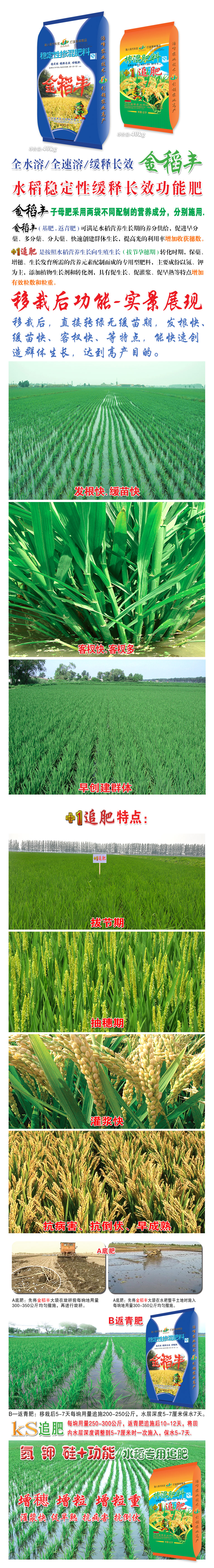 金稻豐子母肥采用兩袋不同配制的營養(yǎng)成分,分別施用。金稻豐(基肥.返青肥)可滿足水稻營養(yǎng)生長期的養(yǎng)分供給,促進(jìn)早分蘗、多分蘗、分大蘗、快速創(chuàng)建群體生長,提高光的利用率增加收獲穗數(shù)。+1追肥是按照水稻營養(yǎng)生長向生殖生長(拔節(jié)孕穗期)轉(zhuǎn)化時期,保蘗、增穗、生⒂璧撓嘏渲貧傻淖ㄓ瞇頭柿?,主要成份揖壀、钾为嘱崿添加謪㈠婜长剂和转化剂,具訉戀生长、促灌浆、促钥r斕忍氐閽黽佑行ЯJ土V亍?