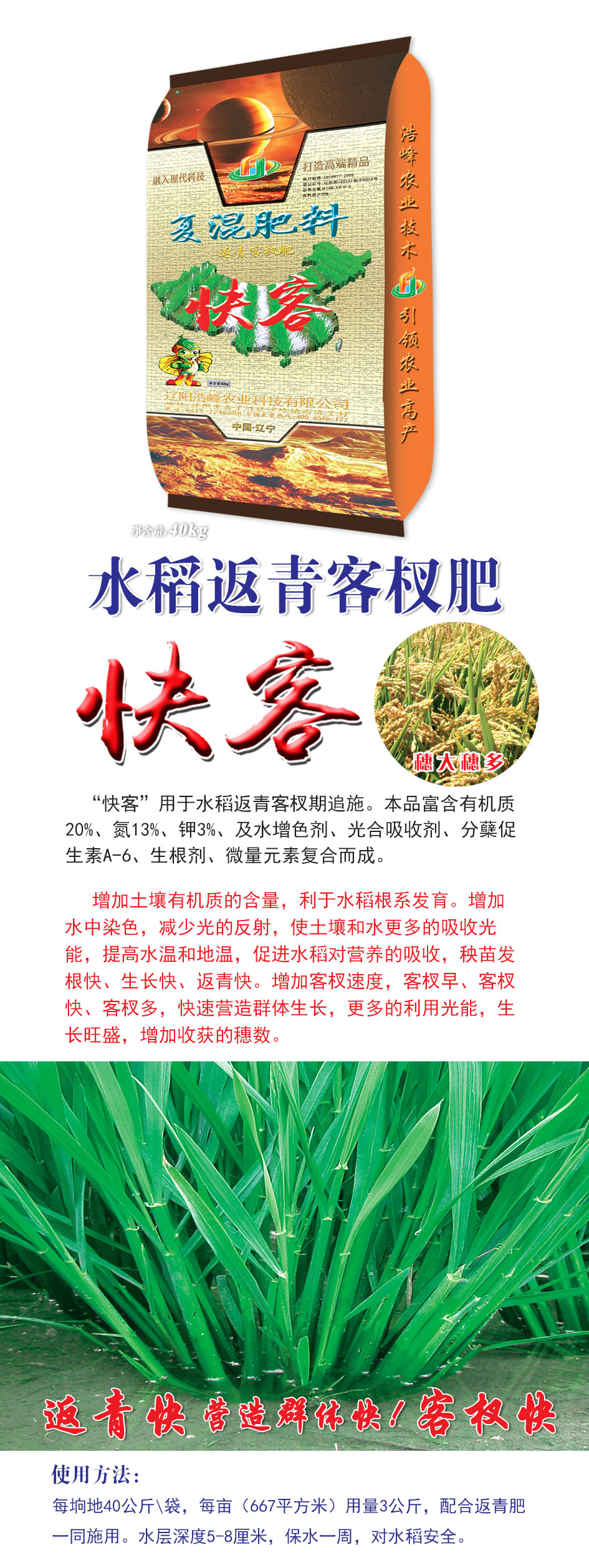 “快客”用于水稻返青客杈期追施。本品富含有機質20%、氮13%、鉀3%、及水增色劑、光合吸收劑、分蘗促生素A-6、生根劑、微量元素復合而成。