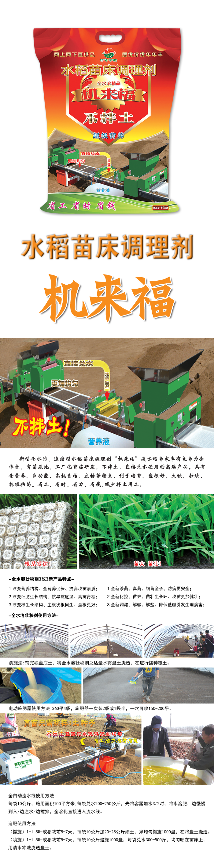 新型全水溶、速溶型水稻苗床調(diào)理劑“機來?!笔撬緦<依钣辛紝楹献魃?、育苗基地、工廠化育苗、機插秧育苗研發(fā),不拌土,直接兌水使用的高端產(chǎn)品。具有全營養(yǎng)、多功能,高抗青枯、立枯等特點,利于培育、大秧、壯秧、盤根好,標準秧苗省工、省時、省力、省錢,減少拌土用工,降低育苗成本,使用更加方便。